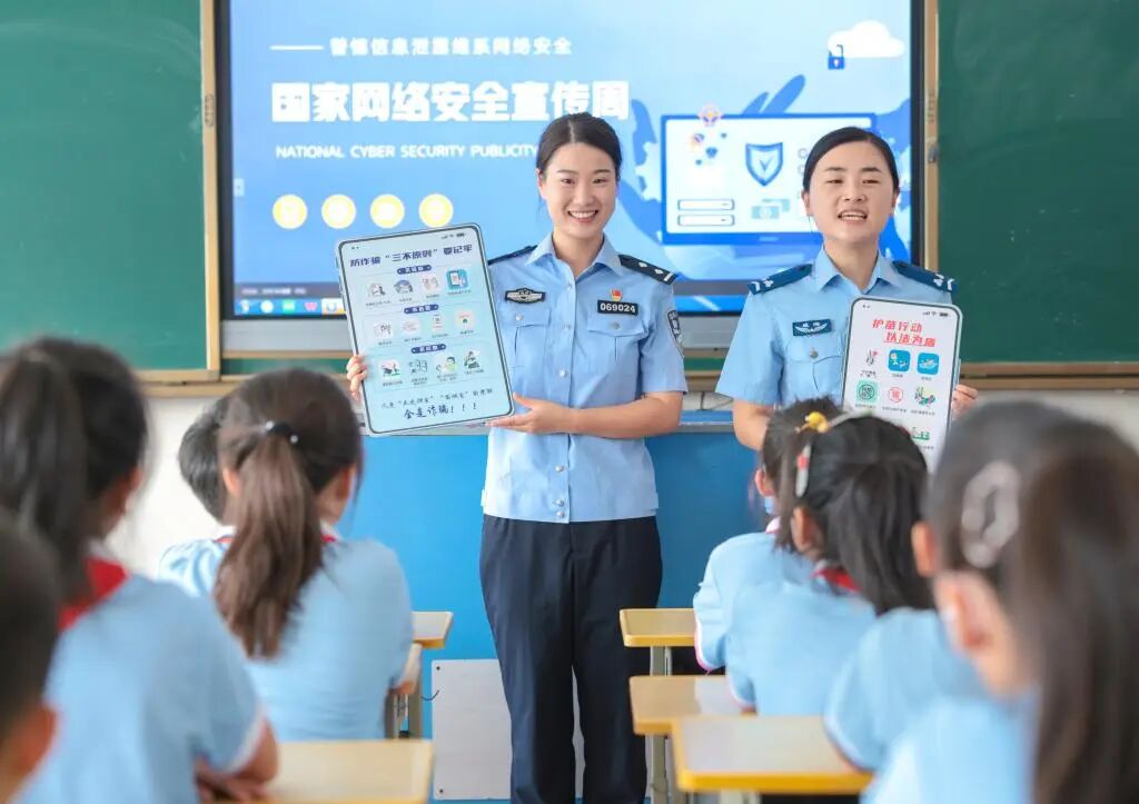 在山东省荣成市府新小学教室内,辖区民警通过案例讲解为学生们普及网络安全和防诈骗知识(2025年9月15日摄)。新华社发(李信君摄)